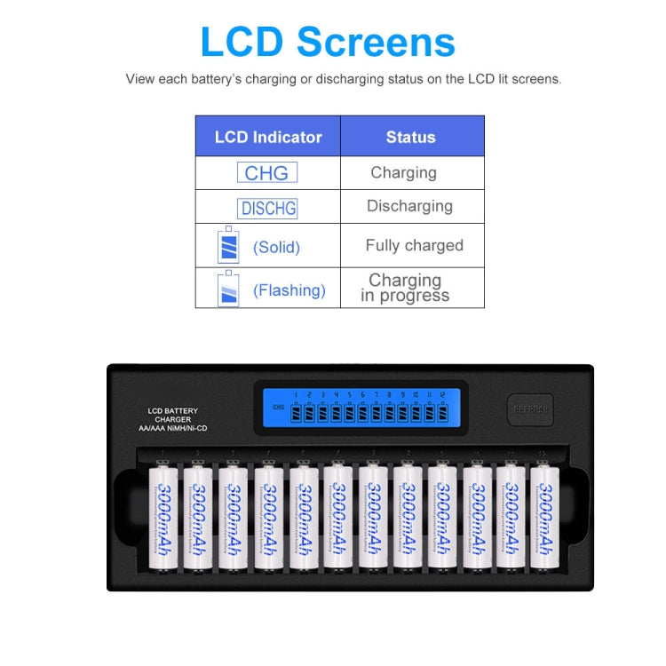 - Efficient Charging: Charge 1-12 batteries in any combination, with each slot capable of charging 5/7 Ni-MH batteries.