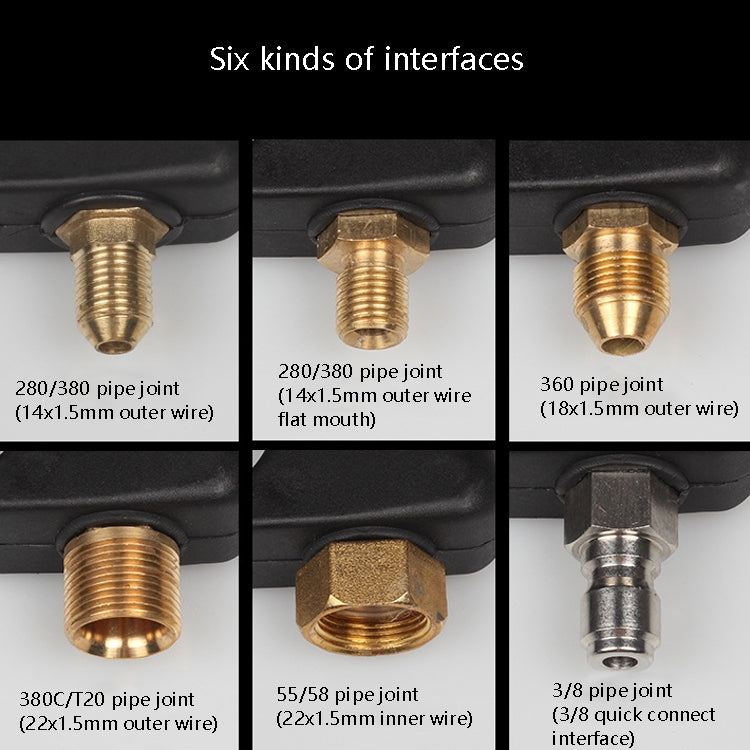 - Interface: Outer wire 14x1.5mm, outer wire 18x1.5mm, outer wire 22x1.5mm, inner wire 22x1.5mm, 3/8 quick plug interface, outer wire 14x1.5mm (flat mouth)