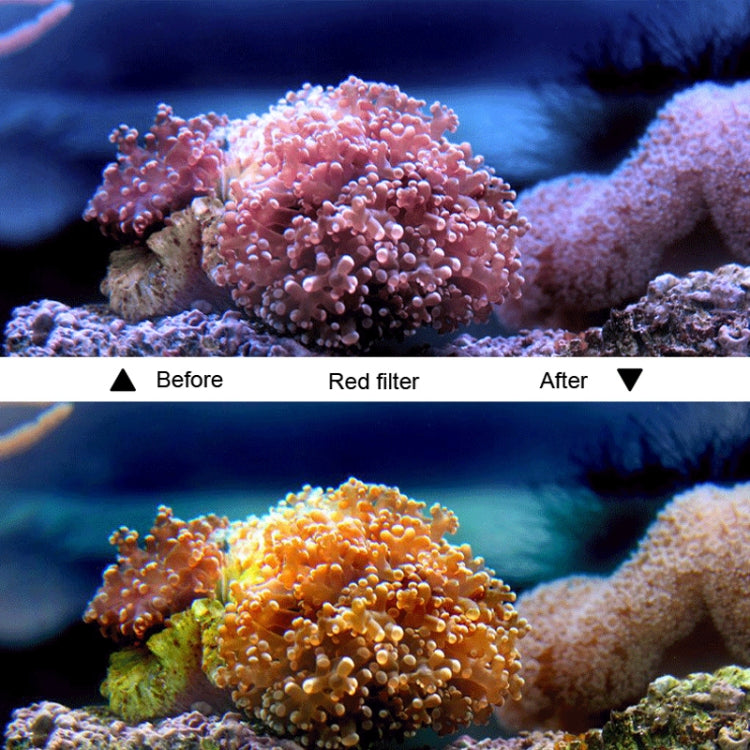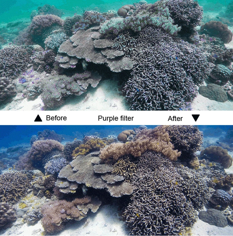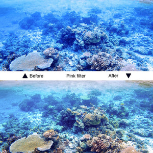 Elevate your underwater photography with the purple filter for freshwater lakes, red filter for blue and tropical water, and pink filter for light blue or shallow water correction.