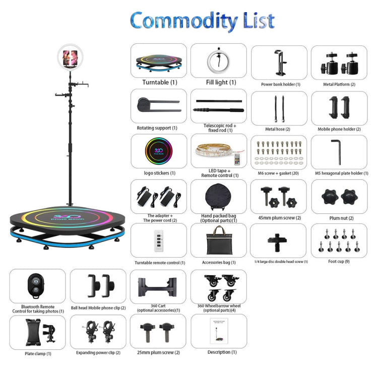 Includes turntable, fill light, rotating bracket, telescopic pole, fixed pole, logo sticker, LED strip with remote control, adapter, turntable remote control, accessory pouch, Bluetooth remote control, foot cup, screws, phone clip, instruction book, and more.