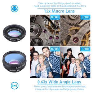 - Versatile 10-in-1 Kit: With 0.63X Wide-angle, 198 Degrees Fish Eye, 15x Macro, 2X Telescope, CPL, Kaleidoscope 3 & 6, Flow Filter, Radial Filter, and Star Filter lenses, this kit offers a plethora of creative options for your photography.