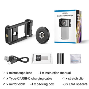 Whether it's insect observation, antique or jewelry identification, circuit board inspection, or even skin examination, this versatile microscope lens offers 100X magnification and is suitable for various applications. The package includes a stretch clip, Type-C/USB-C charging cable, instruction manual, mirror cloth, EVA spacers, and a packing box for convenient use and storage.