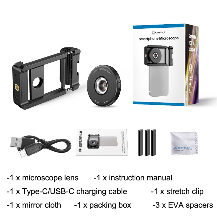 Experience high-definition magnification and portable microscopy with the APEXEL APL-MS009 100X Magnification Jewelry Appraisal Macro Mobile Phone Microscope Lens with LED. No app installation required, this lens is ready to use with any model of mobile phone. The built-in 6 LED fill lights provide uniform brightness, ensuring clear and bright images even in dim lighting conditions.