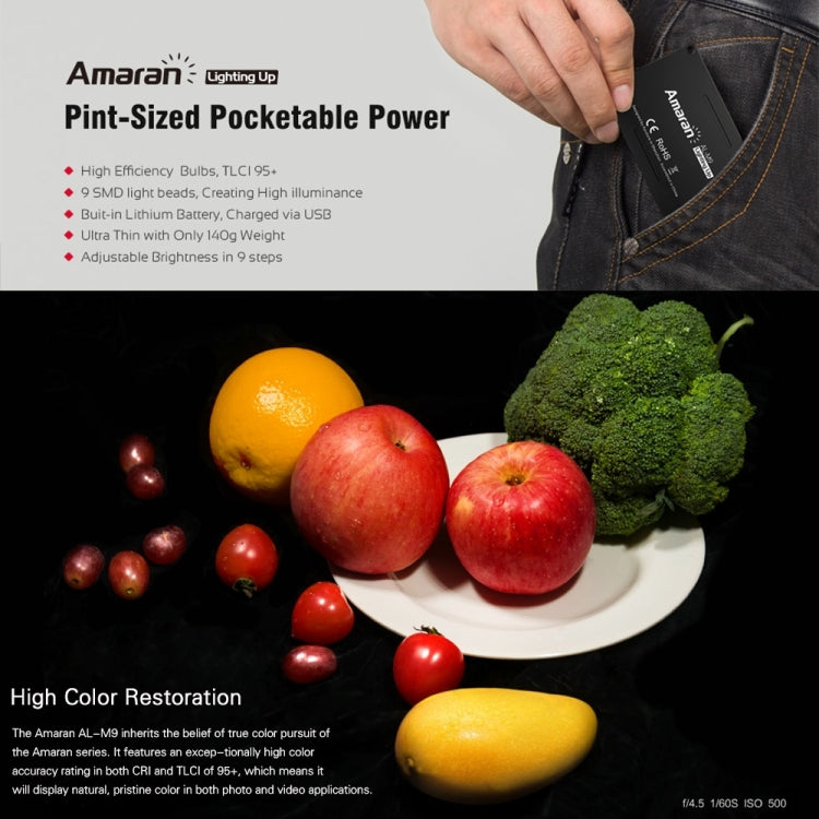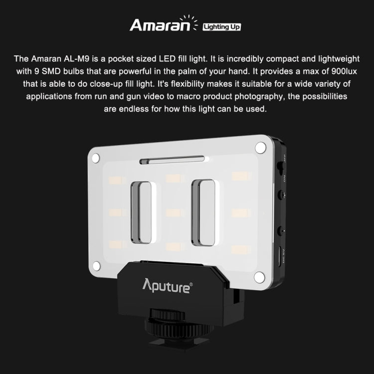 The Aputure Amaran AL-M9 is a versatile pocket-sized LED fill light designed to provide powerful illumination in a compact and lightweight form. Whether you're shooting run and gun videos, engaging in macro product photography, or capturing stunning images, this LED light offers exceptional flexibility and functionality.