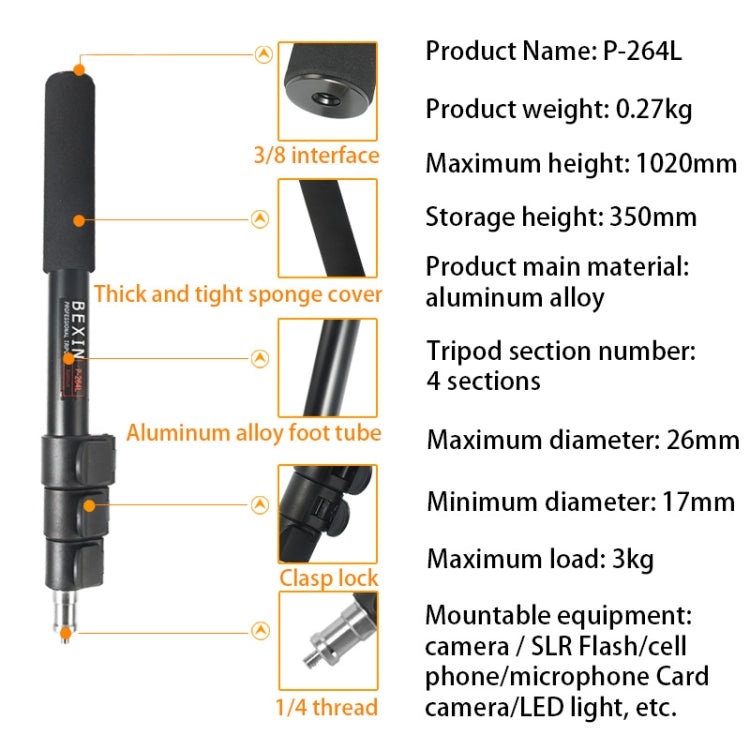 BEXIN P-264L Portable Aluminum Alloy Camera Monopod for Outdoor Photography