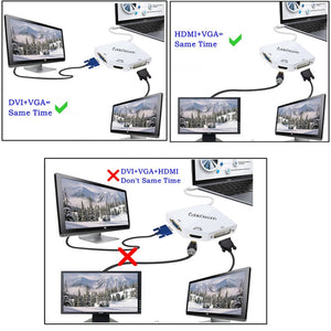 - Impressive Resolution: Enjoy high-quality visuals with support for 3840x2160@30HZ on single HDMI output, 1080P for VGA+HDMI simultaneous display, and 1080P for VGA+DVI simultaneous display (Note: Does not support HDMI+DVI simultaneous display)