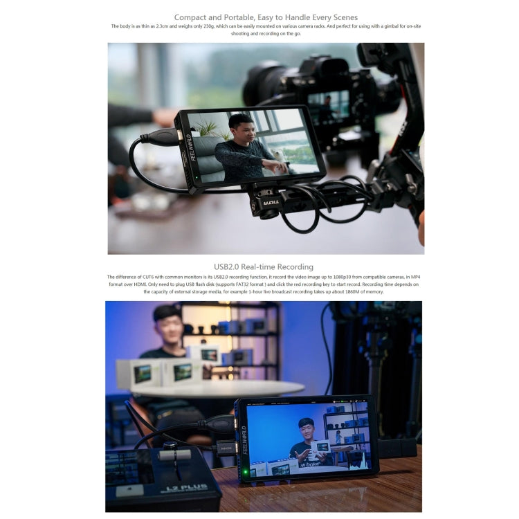 Upgrade your filming experience with the FEELWORLD CUT6 6-inch Touch Screen Monitor Recorder. Packed with features and advanced functionality, this monitor is designed to enhance your shooting efficiency and accuracy. Elevate your filming game with the FEELWORLD CUT6 6-inch Touch Screen Monitor Recorder, your ultimate companion for achieving professional-level video production.