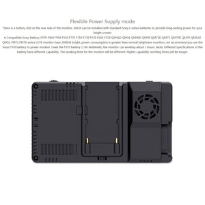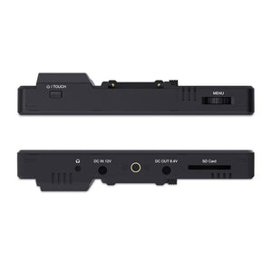 - 4K HDMI input, loop-through output interface, 3.5mm stereo headphone jack, and 12V DC input interface and NP-F battery slot for power supply.