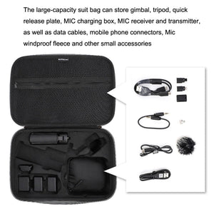 - Large Capacity: Store gimbal, tripod, quick release plate, MIC charging box, MIC receiver and transmitter, data cables, mobile phone connectors, Mic windproof fleece, and other small accessories.