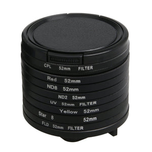 - Includes CPL filter, UV filter, ND8, ND2, Star 8, red, yellow, and purple (FLD) filters, and a waterproof housing case adapter ring