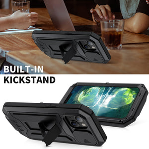 Enhance your iPhone with the ultimate protection and functionality offered by the R-JUST Sliding Camera Shockproof Waterproof Dust-proof Metal + Silicone Protective Case with Holder in Black. This premium case is designed to provide comprehensive protection and convenience with its innovative features.