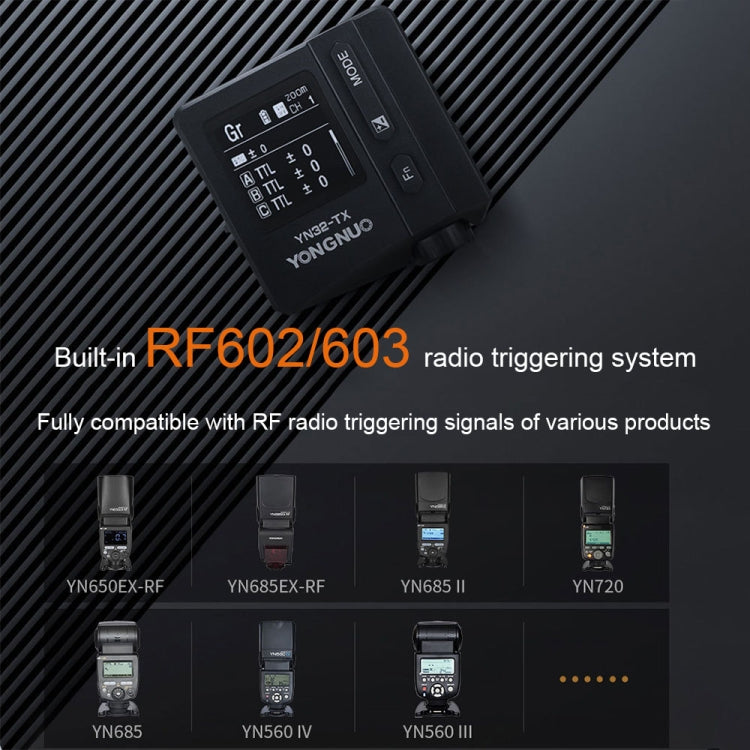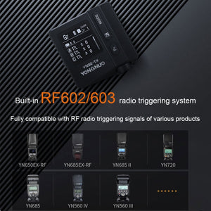 - Compatible with YONGNUO flash and RF radio triggering system