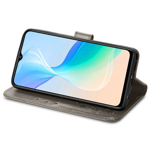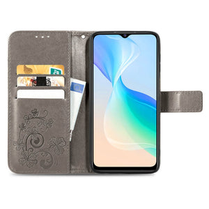Gray Leather Phone Case with Four-Leaf Clasp and Embossed Buckle for vivo Y76 5G