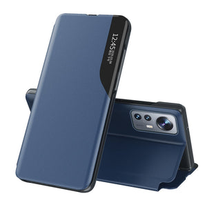 Side Display Flip Leather Phone Case for Xiaomi 12 Pro with Holder in Blue