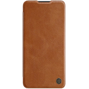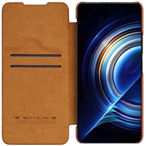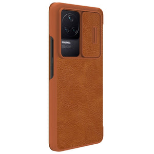 Introducing the NILLKIN QIN Series Pro Sliding Camera Cover Leather Phone Case for Xiaomi Redmi K50 / K50 Pro in Brown.