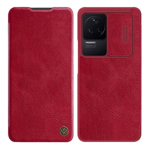 Introducing the NILLKIN QIN Series Pro Sliding Camera Cover Leather Phone Case for Xiaomi Redmi K50 / K50 Pro in Red.