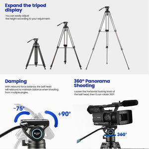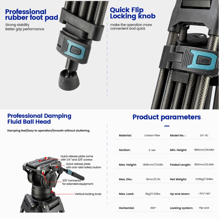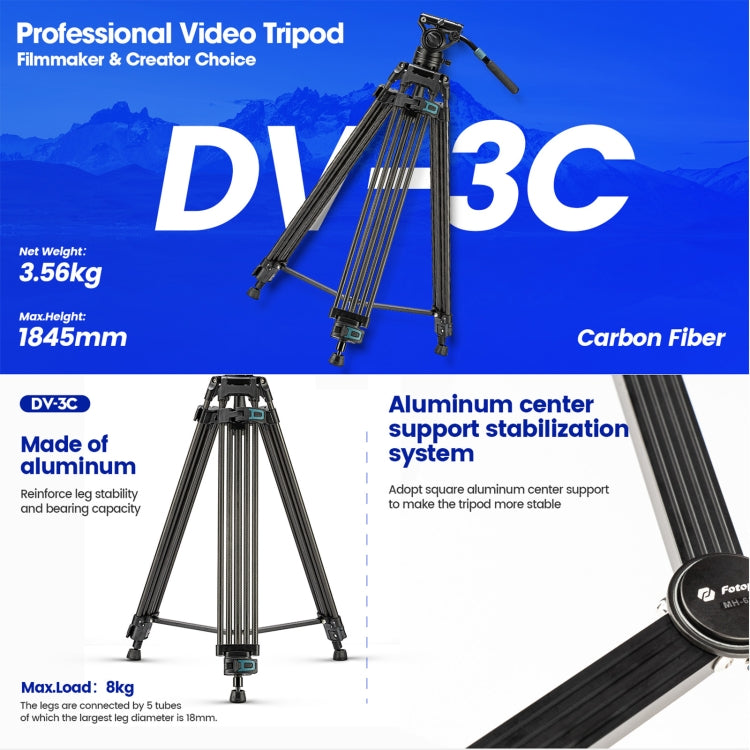 Experience professional-grade stability and versatility with the Fotopro DV-3C Heavy Duty Fluid Head Carbon Fiber Video Tripod. Designed to meet the demands of videographers and photographers, this tripod offers a range of features that set it apart from the rest: