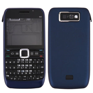 Enhance your Nokia E63 with our high-quality full housing cover, including the front cover, middle frame bezel, battery back cover, and keyboard in a sleek dark blue color.