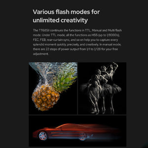 - TCM Instant Conversion: The TT685II-N features TCM function for real-time conversion from TTL mode to manual mode, ensuring accurate light expression with proper exposure value.
