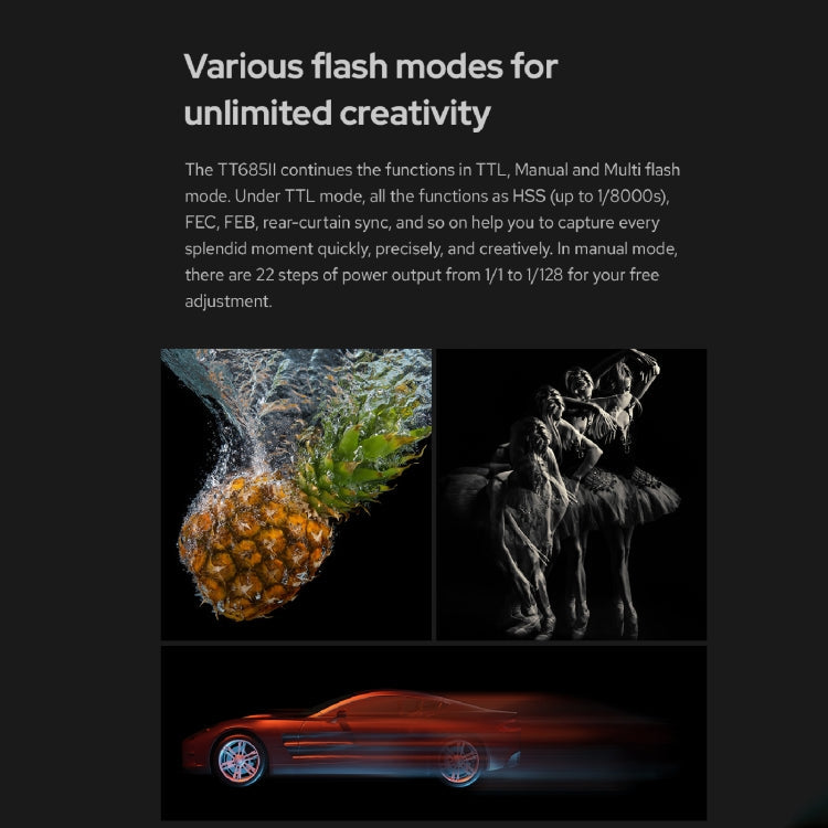 - Powerful functions including HSS (up to 1/8000s), FEC, FEB, and rear curtain sync