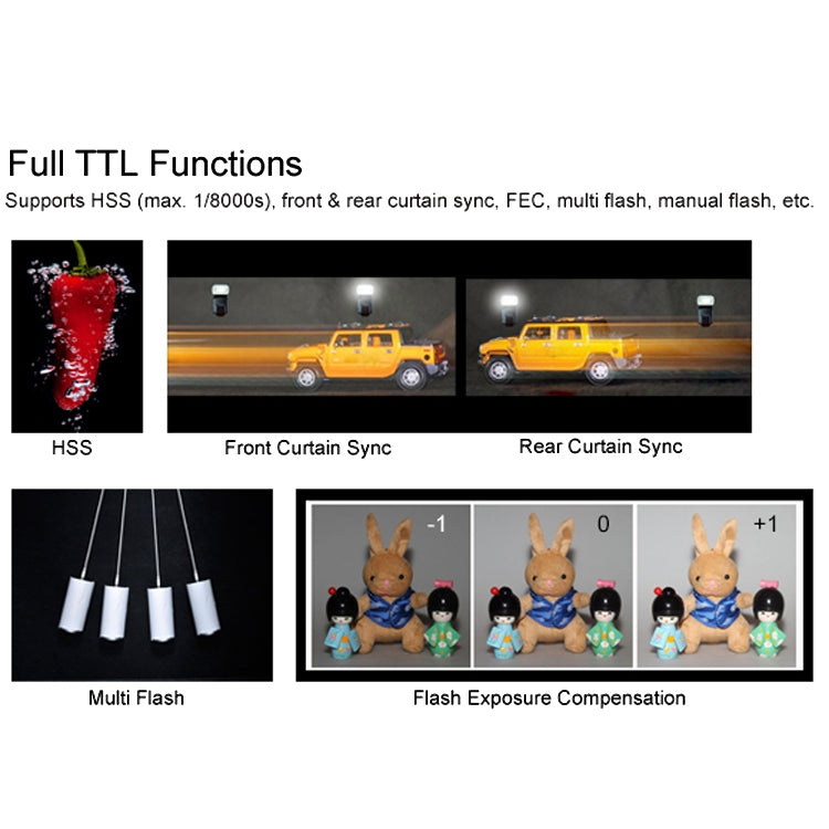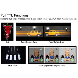 - High-Speed Synchronization (HSS): With a flash time of 1/300 to 1/20000 seconds and high-speed synchronization of up to 1/8000 seconds, freeze action and capture every detail even in challenging lighting conditions.