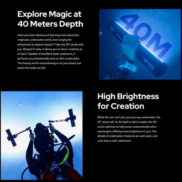 Take your underwater photography and videography to new depths with the Godox WT40R Waterproof Tube Light and witness the difference it makes in your creative endeavors.