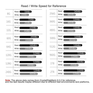 - Read/Write Speed: Read 64-550MB/S, Write 22-500MB/S