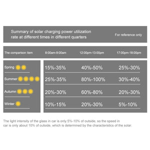 - Note: Does not have storage power function; charging time and current depend on sun brightness