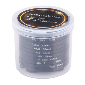 Upgrade your photography and videography game with the JUNESTAR 11 in 1 Professional Lens Filter kit. This big pack includes CPL, UV, ND8, ND4, ND2, Star 8, Red, Yellow, FLD/Purple filters, along with a waterproof housing case adapter ring and lens protective cap, all in one convenient pack.