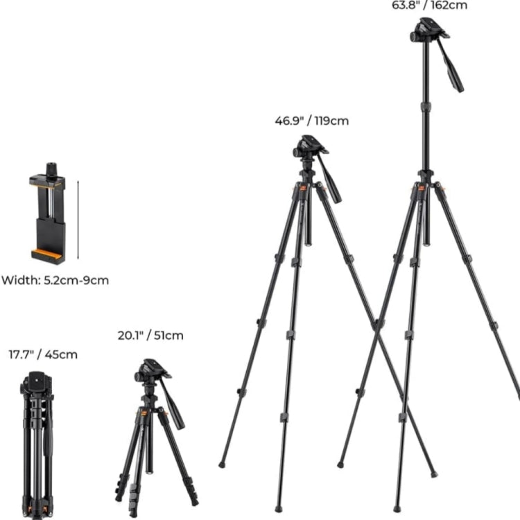 - Lightweight and Portable: With a 4 section leg, this tripod can easily adjust from 20.1 inches to 63.8 inches in height. It can be folded to a compact 15.3 inches, making it incredibly portable. The net weight, including the ball head, is only 2.55lbs/1.16 KG.
