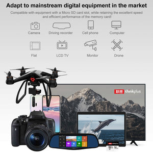 - Applicable devices support TF card: smart phone, driving recorder, digital camera, car navigation, surveillance camera, tablet PC, drone, speaker, sports camera, laptop, etc.