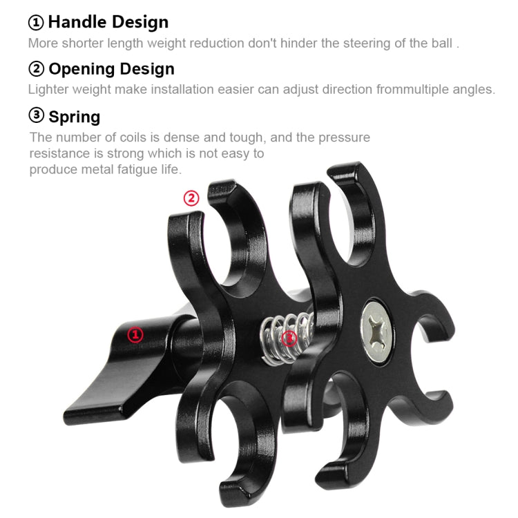 Enhance your underwater photography system with the PULUZ Triple Ball Clamp Open Hole Diving Camera Bracket. Crafted from durable hard coat anodizing aluminium, this spring flashlight clamp is designed for seamless functionality and longevity.