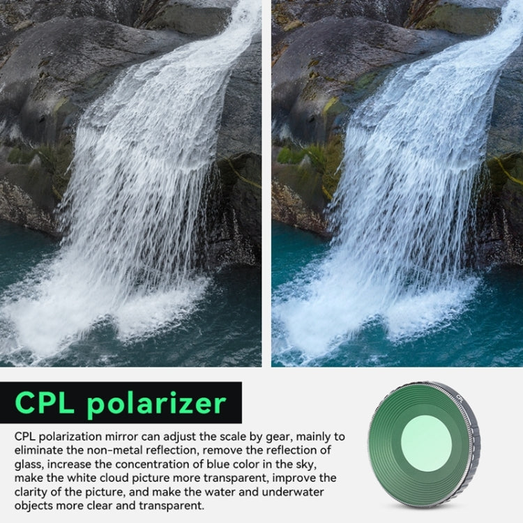 - CPL Polarizer: Eliminates non-metallic reflection, enhances sky color, transparency of clouds, and underwater clarity