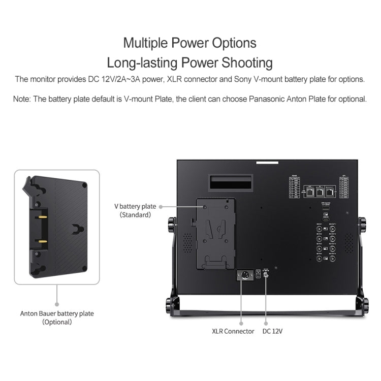 - Package: The package includes essential accessories such as SDI cable, Mini HDMI cable, V-mount battery plate, sunshade, U-shape bracket, power adapter, and user manual for added convenience.