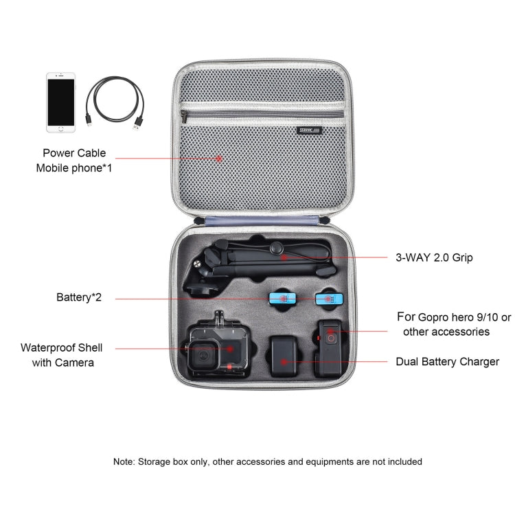 1. Designed for GoPro HERO10 Black /9 Black sports camera, precise mold opening, small size but large capacity, can accommodate 2.0 three-way selfie stick at the same time, battery + waterproof case + two-way charging box + camera and other small accessories