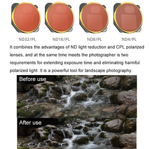 - ND/PL Adjustable Light Reduction and Polarized Filter: Combines ND light reduction and CPL polarized lenses, making it a great tool for landscape photography.