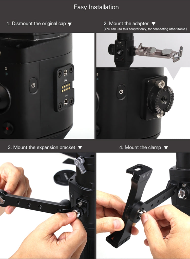 - Extension clamp mount bracket kits specifically designed for the DJI Ronin-S stabilizer