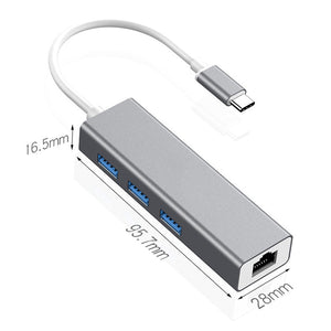 Experience seamless connectivity with our USB-C / Type-C to Fast Ethernet RJ45 & 3 x USB 3.0 Adapter Converter HUB in a sleek grey finish.