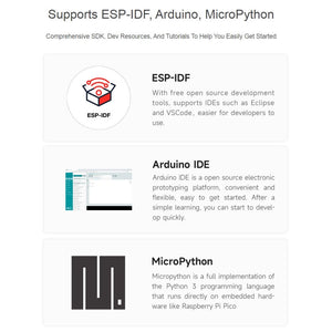 Choose from various development environments such as ESP-IDF, Arduino, and MicroPython to kickstart your projects effortlessly. The board's compatibility and expandability make it ideal for a wide range of applications.