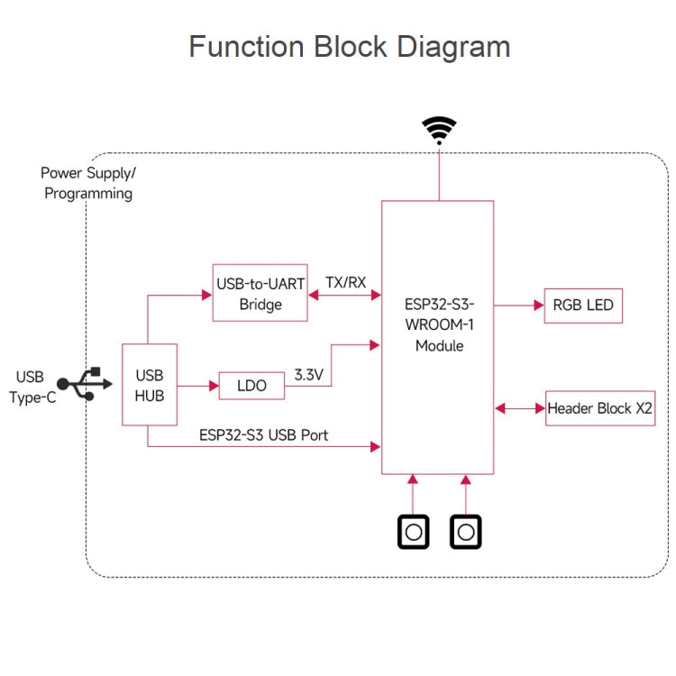 - Integrated 512KB SRAM, 384KB ROM, 8MB PSRAM, and 8MB Flash memory