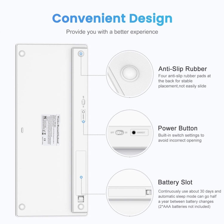 - Power-saving Functionality: Equipped with a power switch, this keyboard helps conserve energy when not in use, powered by 2 x AAA batteries (not included).