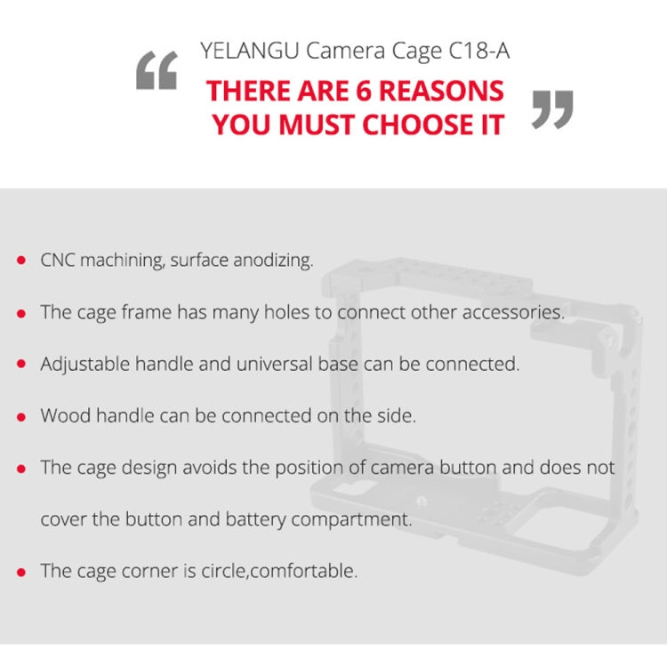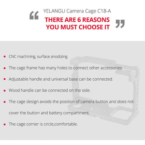 Enhance your videography with the YELANGU C18 YLG0915A-A Video Camera Cage Stabilizer designed specifically for Panasonic Lumix DC-S1H, DC-S1, and DC-S1R cameras. Crafted with precision using CNC machining and featuring an anodized surface, this stabilizer is not only strong but also built to last.